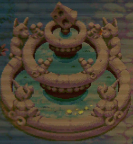 噴水のようなオブジェクトに紫の光を捧げると、手持ちの各モルセルの状態異常が一定確率で治る。