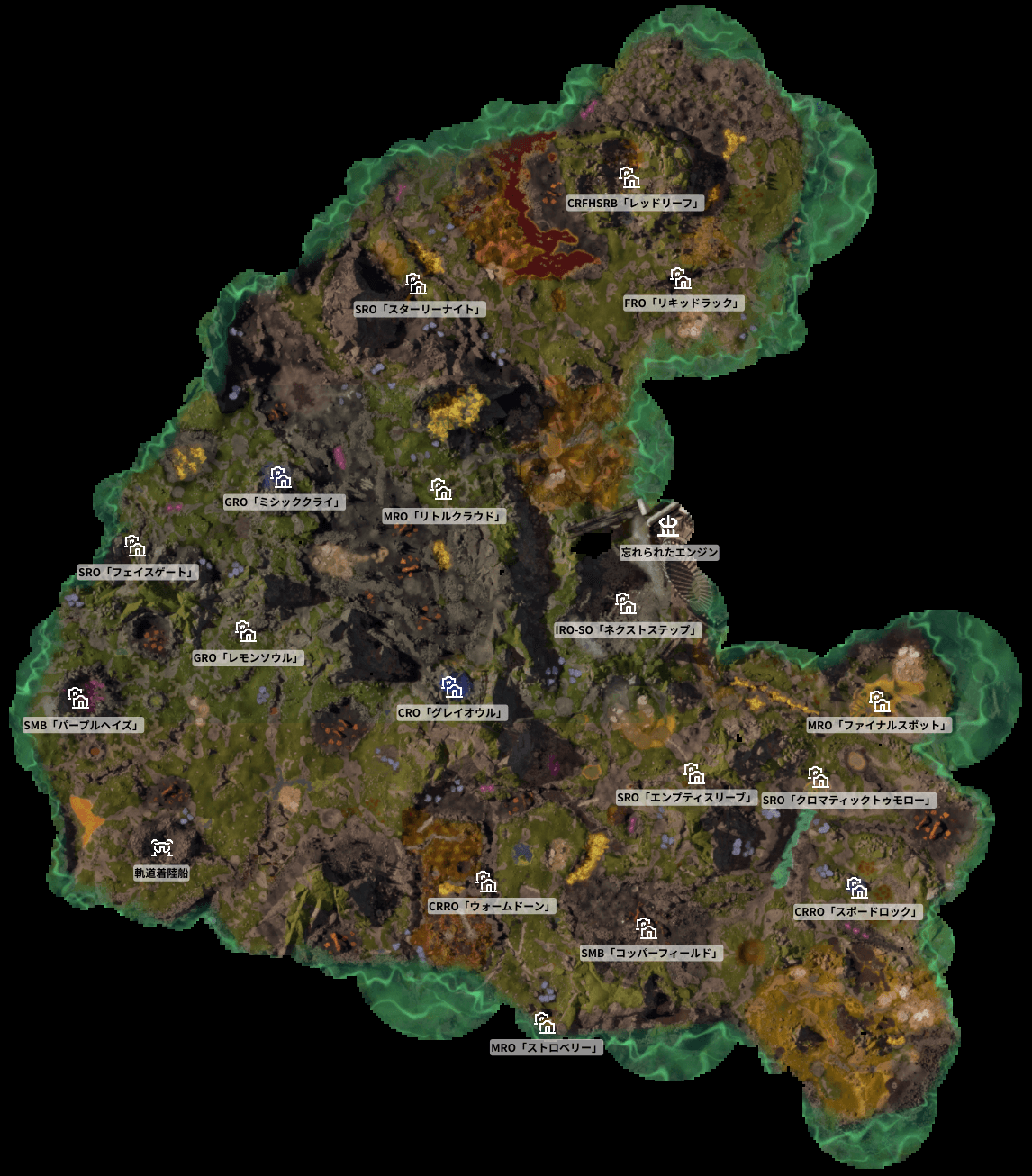 全体マップ上での基地(放棄されたベース)の場所のまとめです。